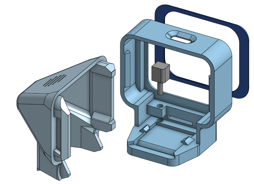 The case design is inspired by late 90's TV/VCR combos like the Sony KV-14V6D. It was made with OnShape and has 4 parts: front, back, bezel and button. Glue is required to stick the bezel to the front part, the rest of the assembly snap fits (with pretty tight tolerances). Printing the parts separately allows for interesting color combinations.