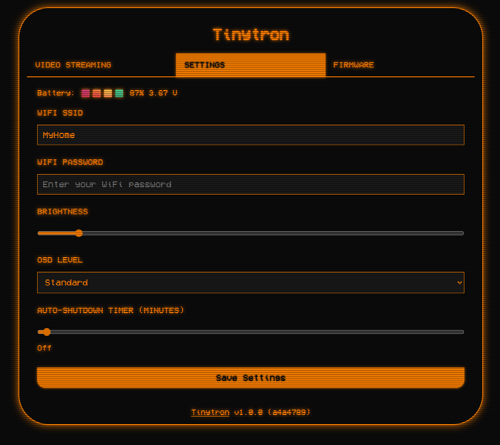 Tinytron-XXXX (the value of XXXX is specific to your device).192.168.4.1.The web interface allows you to: