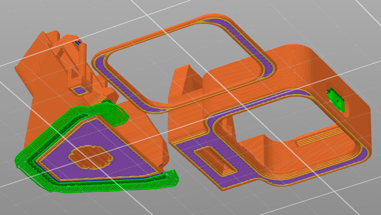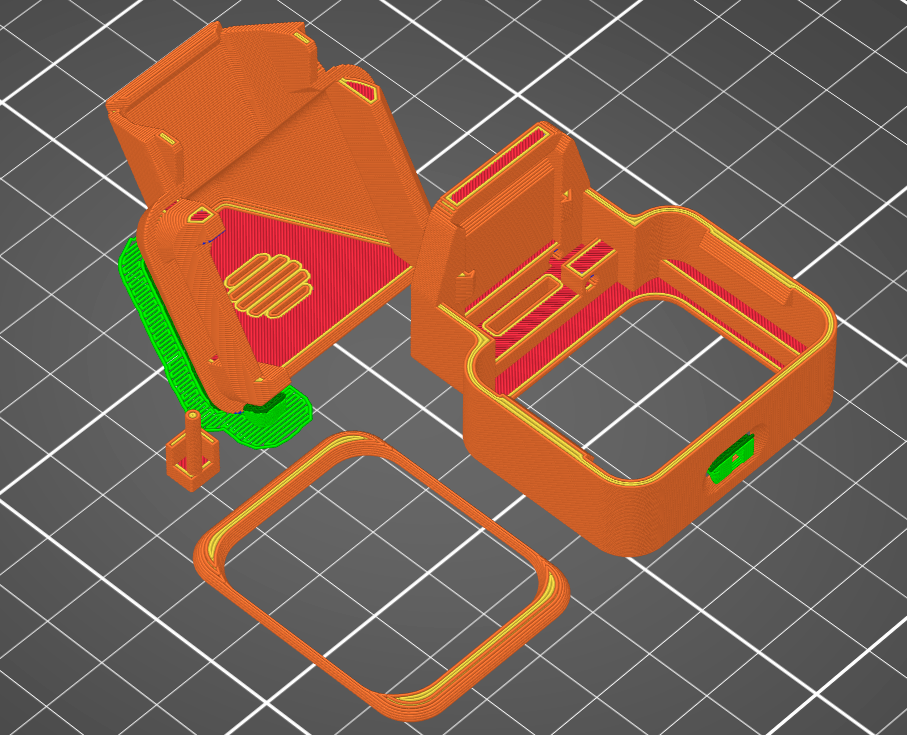The case was only tested with Prusa MK4S and PLA. It prints with 0.28mm layers in about 30 minutes and 16 grams of material. I tried my best to limit the need for supports but paint-on supports (pictured in green in the screenshots below) are recommended in select spots for best results.